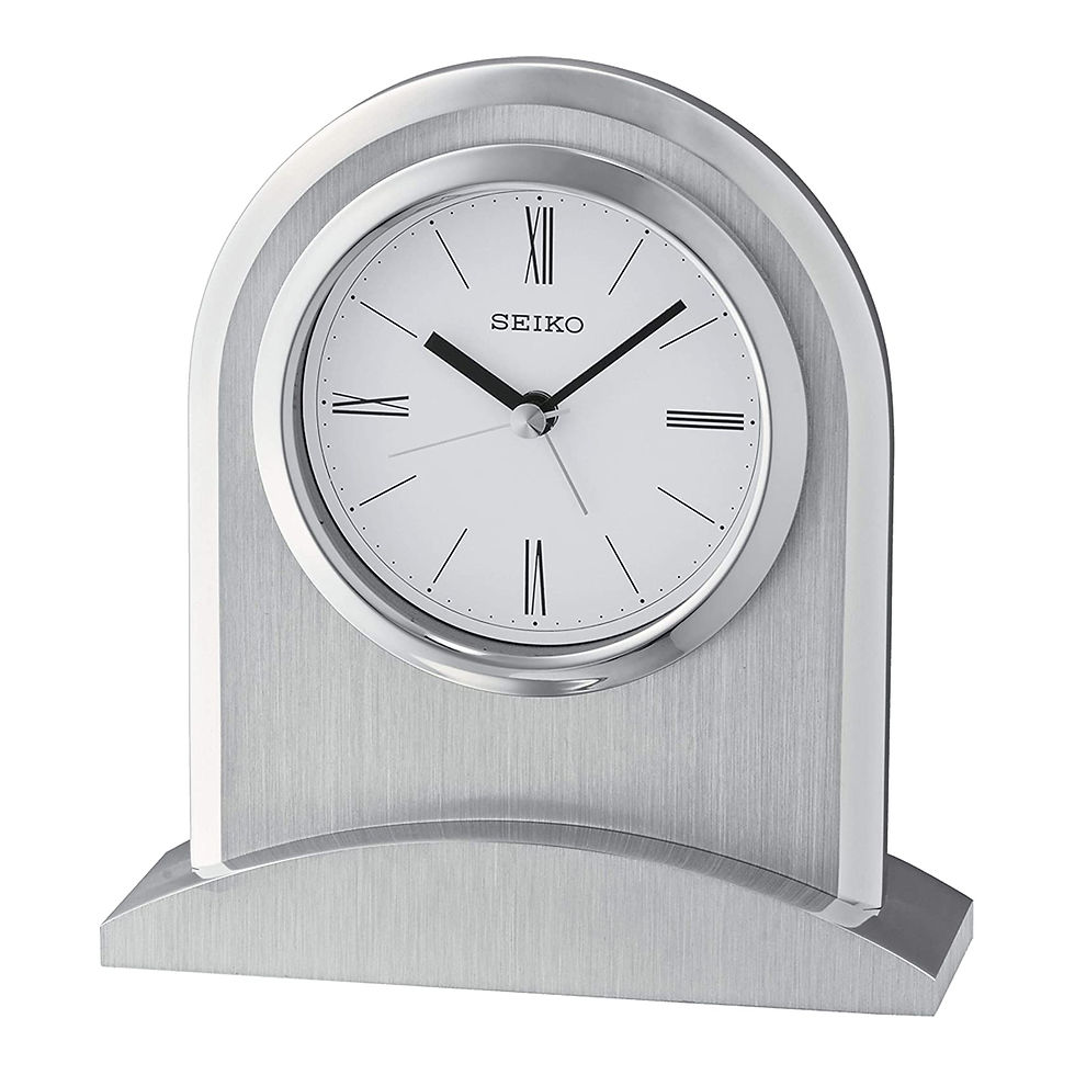 Metal silver caseBeep alarmWhite face with black Roman numeralsPowered by 1 AA battery (included)Overall dimensions: 4 X 4.75 X 1.75