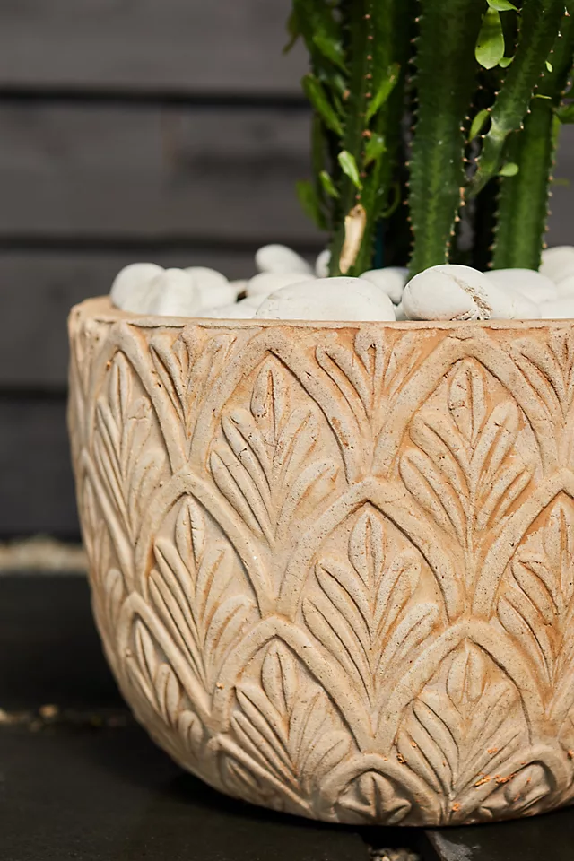 Expertly crafted from textured terracotta, this outdoor planter is embellished with a natural botanical pattern all over.